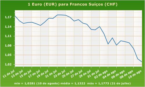 O gráfico mostra as taxas de câmbio históricas entre o Franco Suíço (CHF) e o Euro (EUR) no período de 11/7/2011 a 10/8/2011