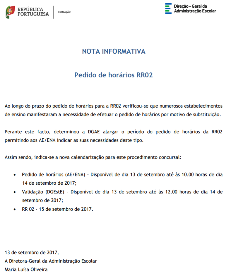 Ao longo do prazo do pedido de horários para a RR02 verificou-se que numerosos estabelecimentos de ensino manifestaram a necessidade de efetuar o pedido de horários por motivo de substituição. Perante este facto, determinou a DGAE alargar o período do pedido de horários da RR02 permitindo aos AE/ENA indicar as suas necessidades deste tipo.