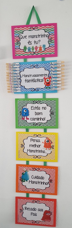 Os nomes dos alunos estão rotulados em etiquetas e colados em molas de madeira.