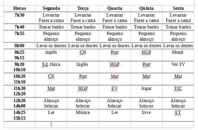 Pode desenhar o seu horário com lápis e régua, ou usar este como exemplo: descarregue o horário.