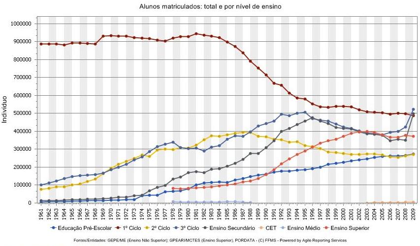 Já existem mais alunos no Ensino Secundário e 3. Ciclo do que no 1.º Ciclo, em 2009 no 3. Ciclo havia mais 35011 alunos do que no 1.Ciclo e mais 10213 alunos no Ensino Secundário do que no 1. Ciclo.