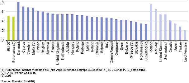 Neste gráfico vemos que Portugal está no meio dos Países da União Europeia no que diz respeito à despesa na Educação em percentagem do PIB, mas como nos mostra o próximo gráfico, o PIB Português está no grupo dos mais baixos da UE.