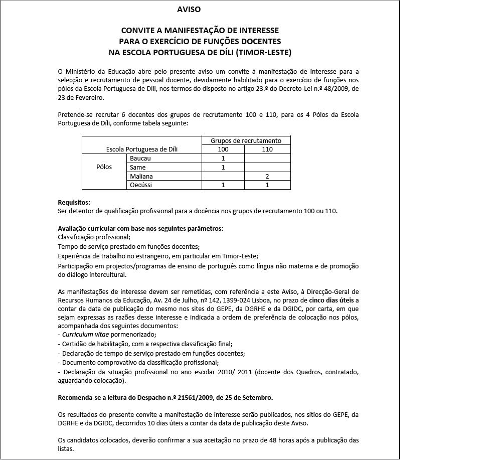 2. Convite a Manifestação de Interesse para o Exercício de Funções Docentes na Escola Portuguesa de Díli (Timor-Leste)