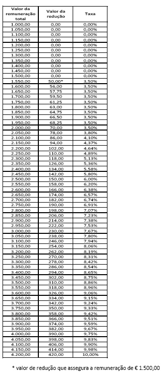 2. A redução remuneratória incide, apenas, sobre as remunerações totais ilíquidas de valor mensal superior a € 1.500,00, encontrando-se isentas de redução todas as remunerações totais de valor inferior.