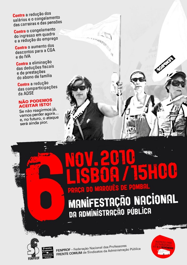 A Função Pública foi prejudicada a dobrar, levou duas marretadas e em 6 de Novembro é o dia de nos queixarmos da cabeça, professores, enfermeiros, médicos, técnicos superiores, terão cortes de rendimentos que rondam os 20% em 2011, enquanto o Estado esbanja o nosso dinheiro em projectos faraónicos e mal geridos.