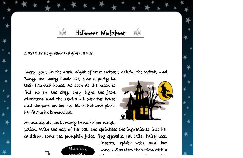 Read the story below and give it a title. _________________________________________ Every year, in the dark night of 31st October, Olivia, the Witch, and Bony, her scary black cat, give a party in their haunted house. As soon as the moon is full up in the sky, they light the jack o’lanterns and the skulls all over the house and she puts on her big black hat and picks her favourite broomstick.